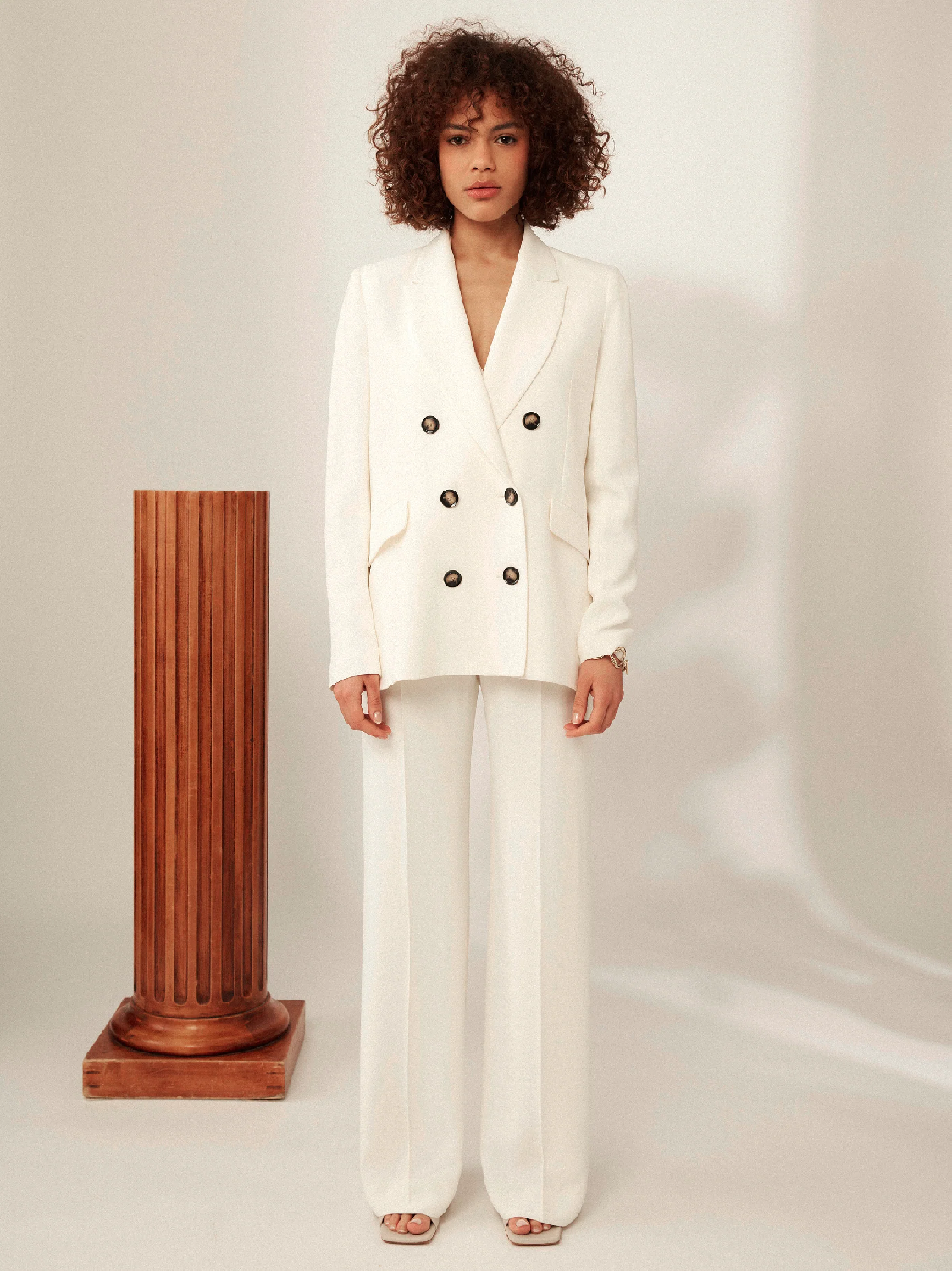 Double-breasted tailored jacket, straight fit, dark brown buttons. Mid-rear length.