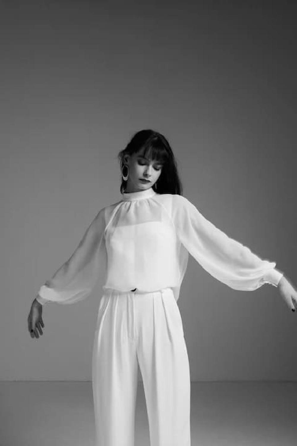 Sheer blouse with a small mock neck, buttoned closure at the neck.Long sleeves with fitted cuffs.