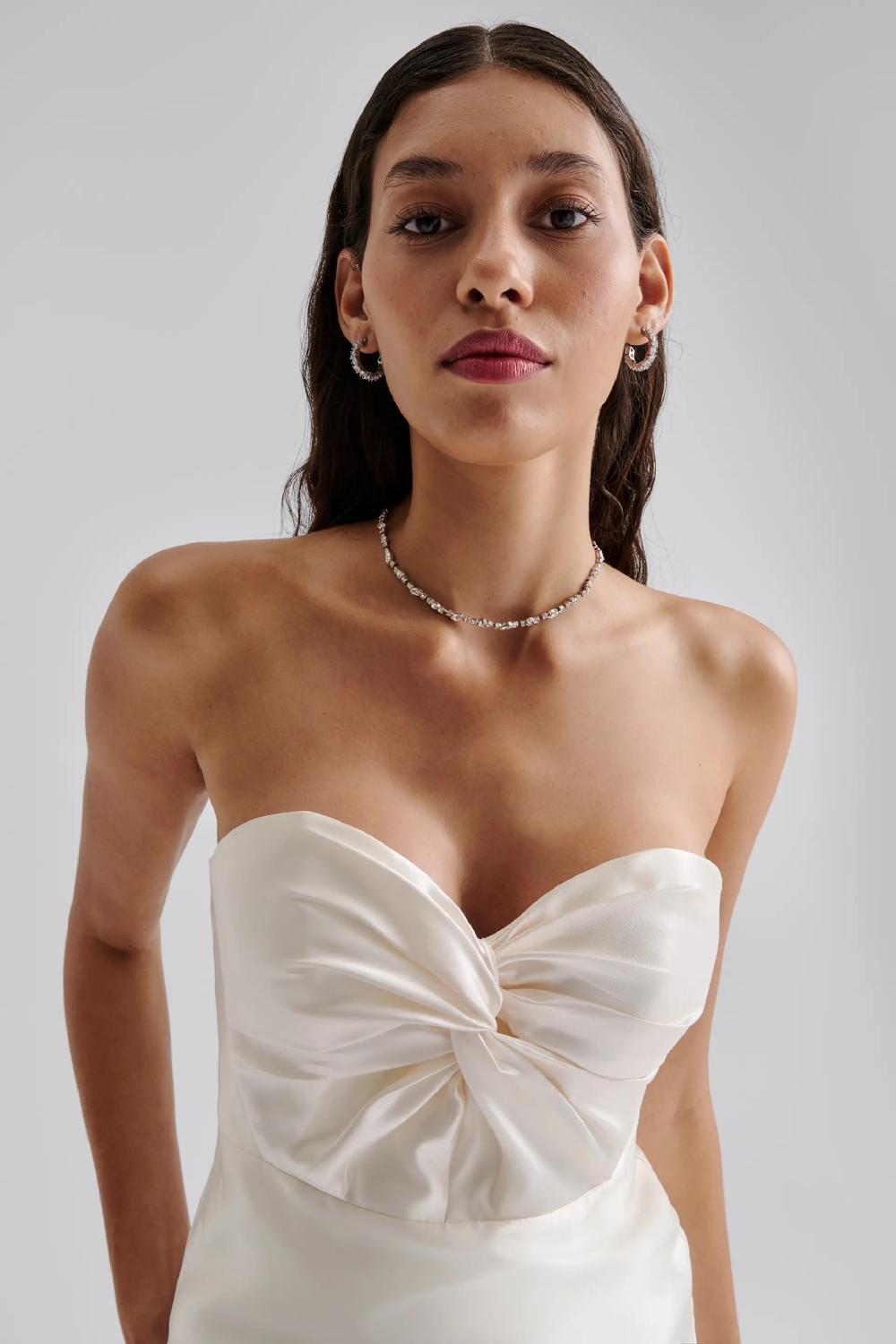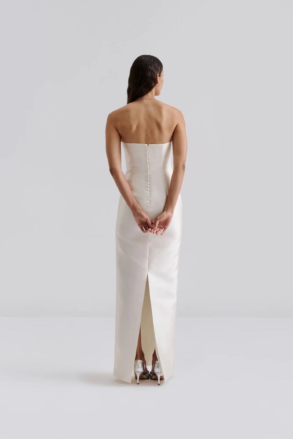 Robe de mariée bustier en tissu brillant avec fente au dos.