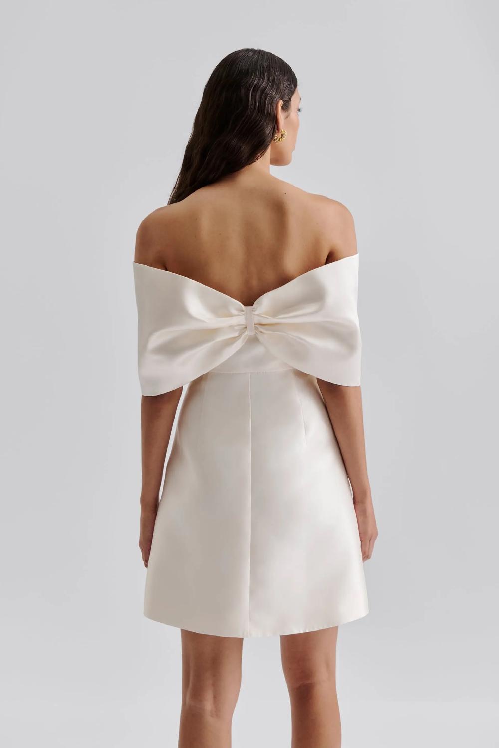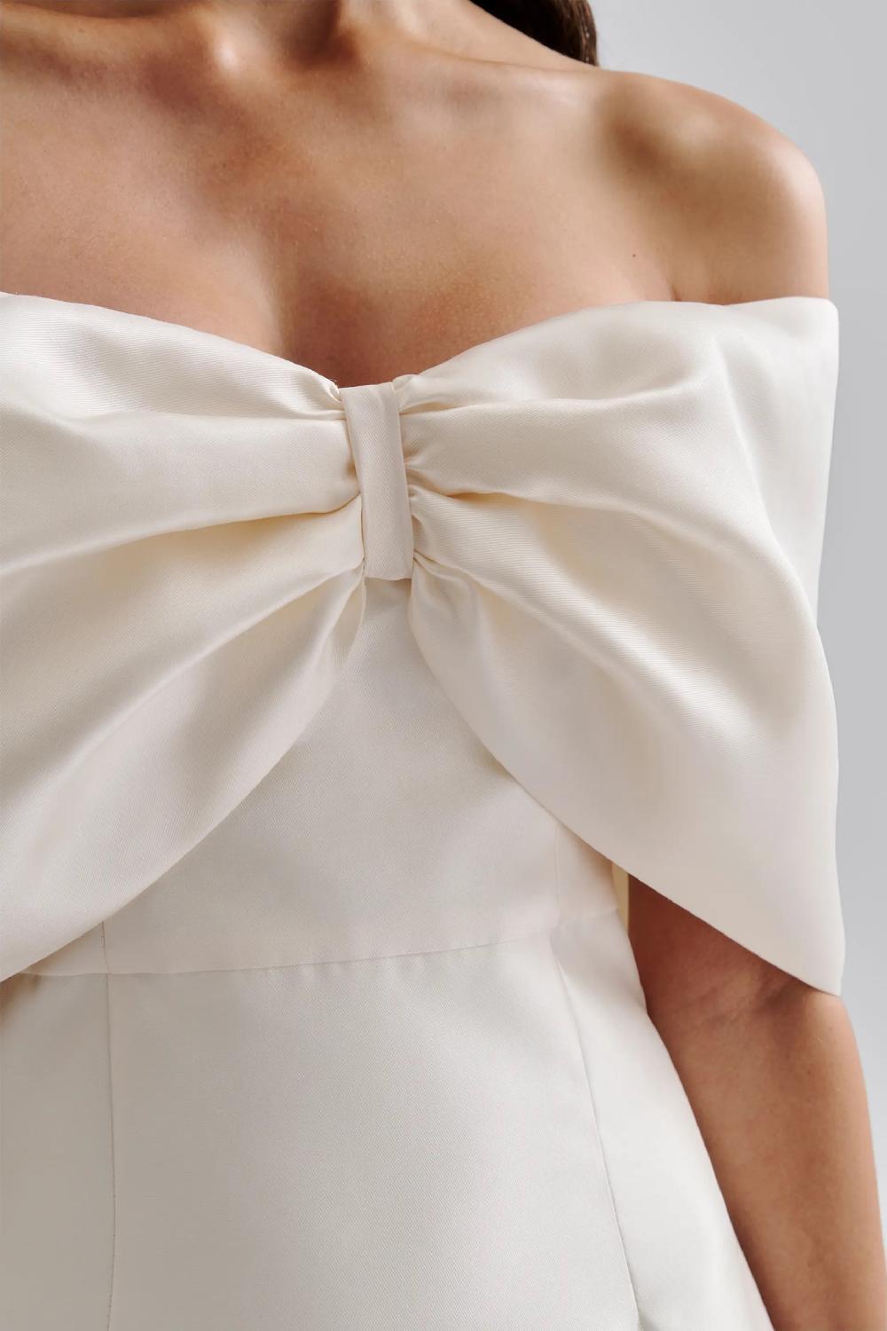 Robe de mariée courte en matière brillante avec un détail nœud drapé et des épaules dénudées.