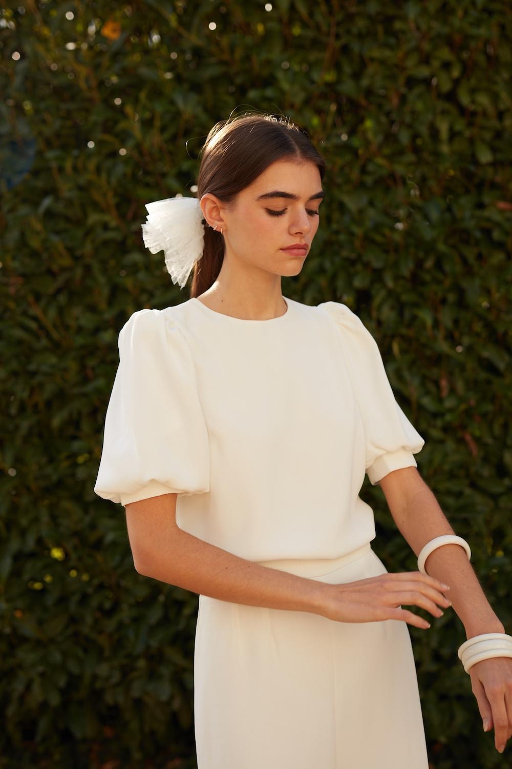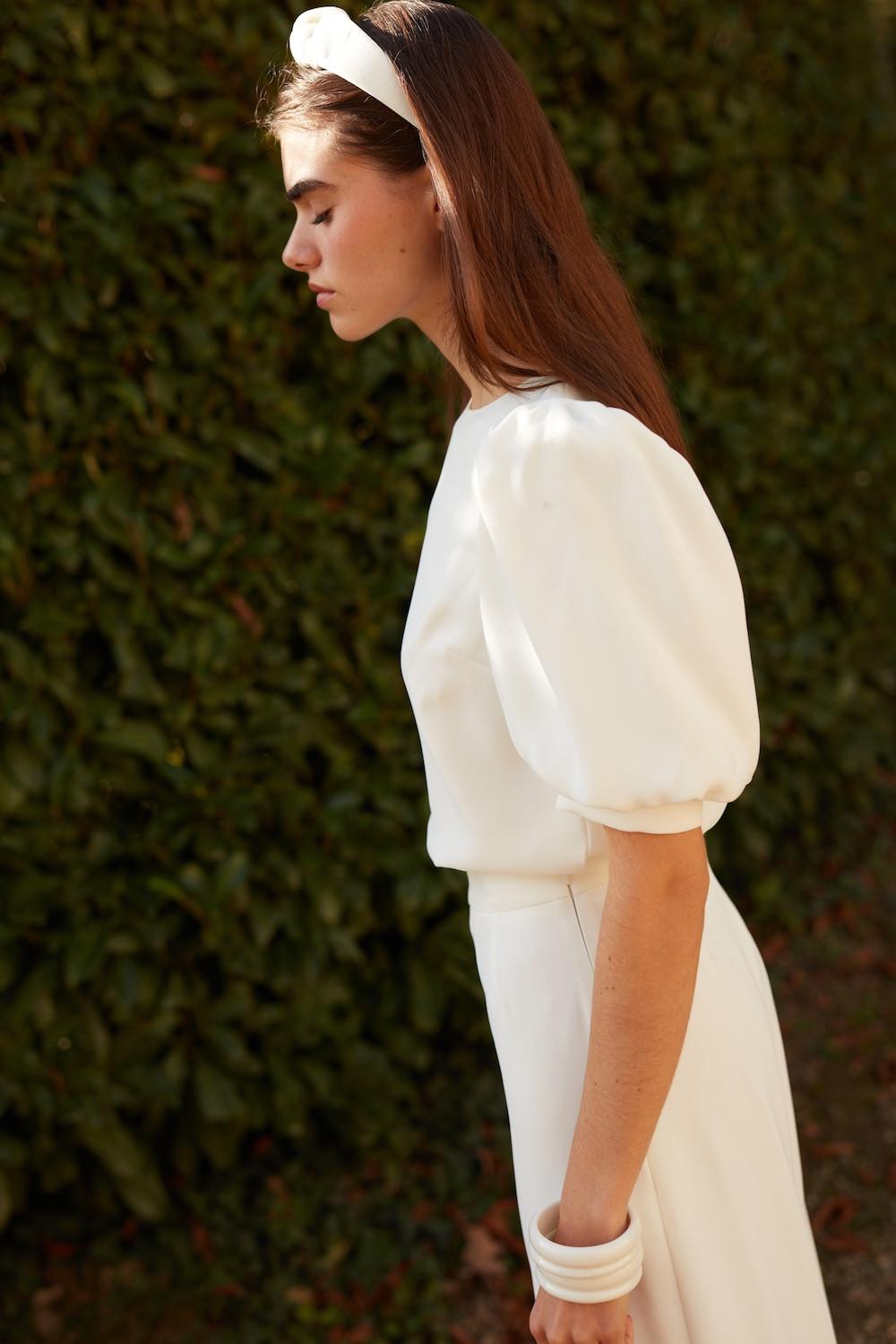 Cette pièce forte se caractérise par ses manches ballons soutenues par un bracelet de tissu pour un effet mode et structuré.